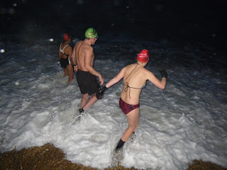 Again a night swim! Alex, Joan and Sarah dare to enter in a very chilled and choppy sea. After a quick undress, the 3 of us run down to the beach on a fast pace in an 'I race you' behaviour, ending in a courageous entry in a low tide at saltdean beach. We started at left groyne, hopping, jumping and diving through the waves, but due to the strong current, the 3 of us found theirselves very close the right groynes. Running 'stef style' and swimming away from the right groyne we aim back to the left groyne. After 10 intense minutes of varies fitness swimming exercises, we run back to the most wanted, Joan's mince pies. What a delight! and still warm :)
